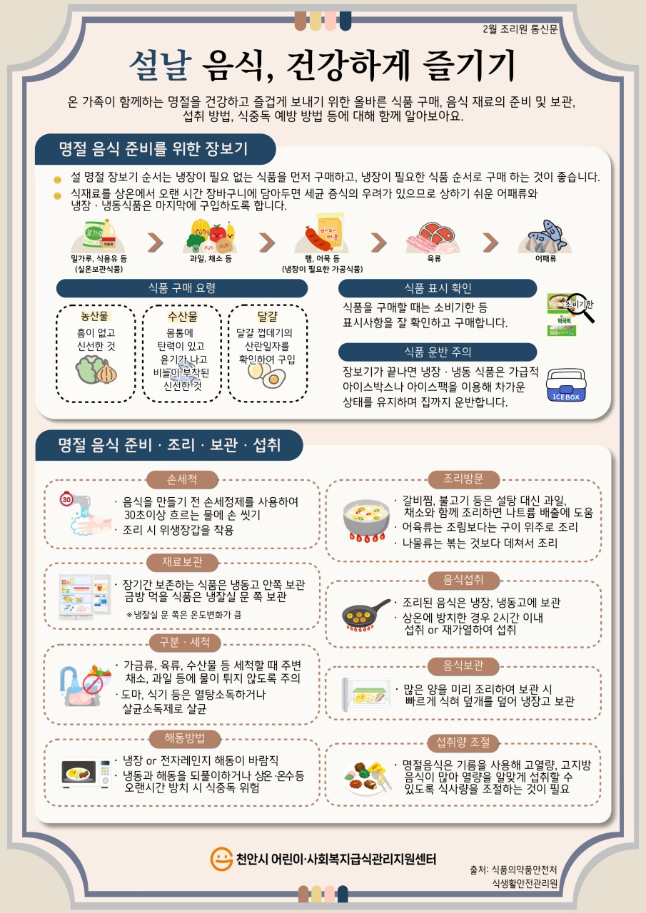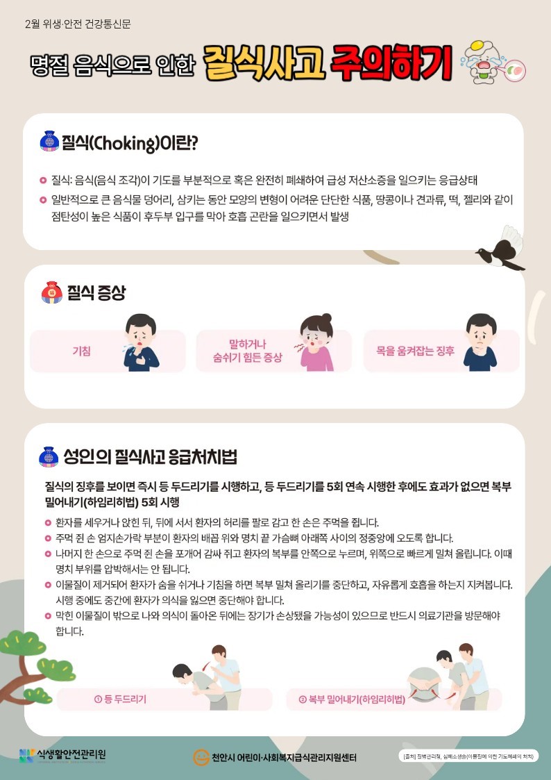 | 제목 | “명절 음식, 안전하고 건강하게 즐기세요 — 질식사고 및 식중독 예방 안내” | 공지일 | 2026.02.02 |